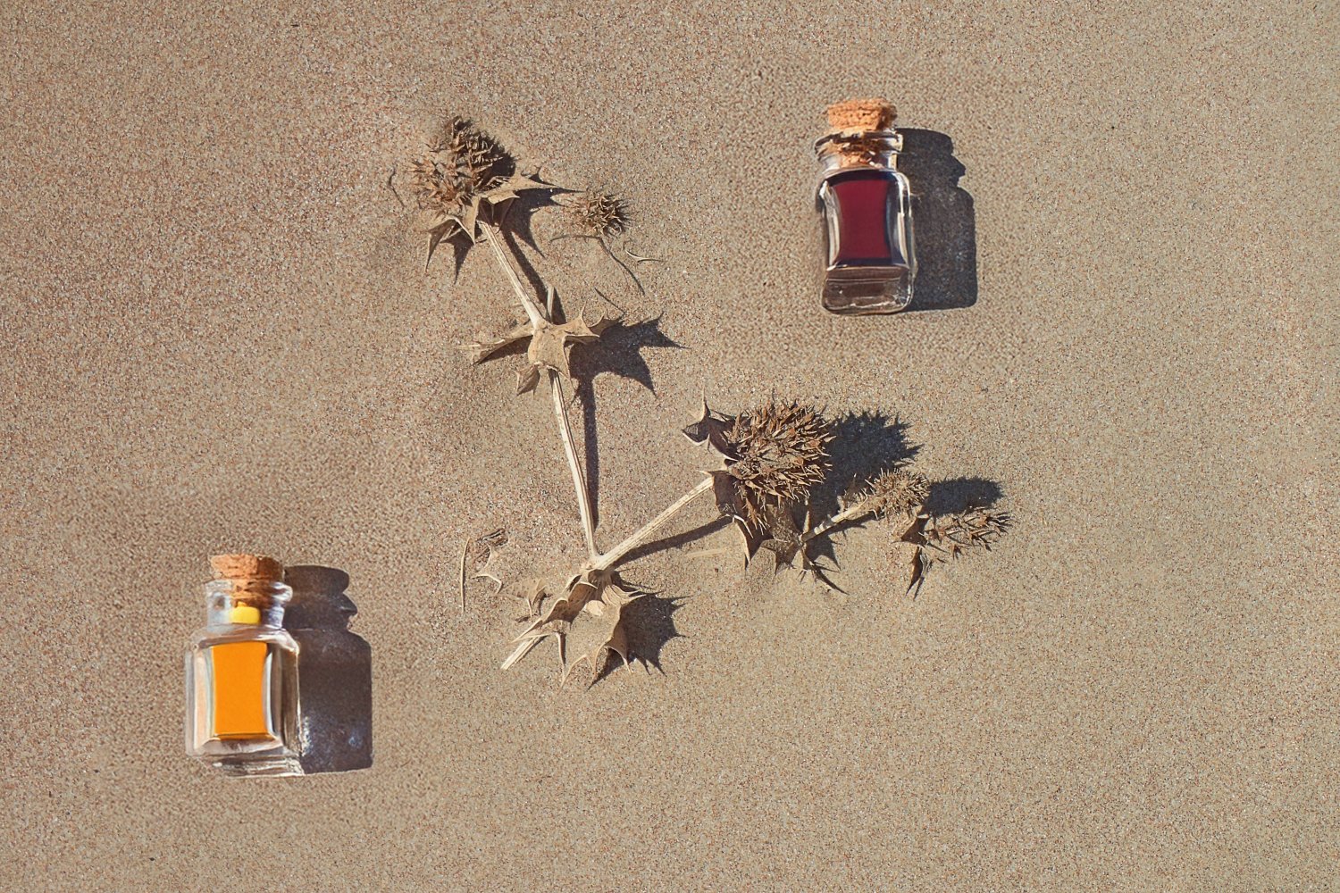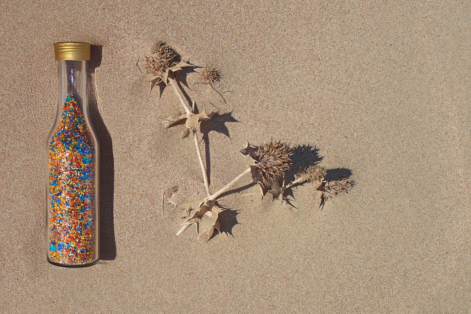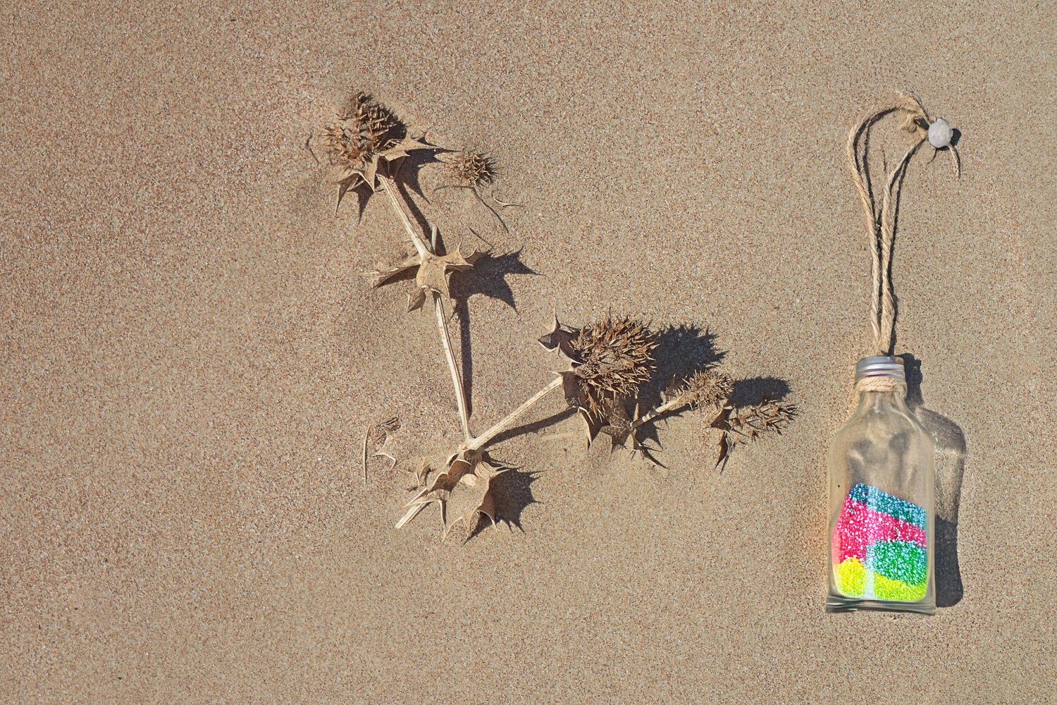 Σε αυτή την προσέγγιση, το φόντο της άμμου τονίζει και αναδεικνύει τα ζωηρά χρώματα των μπουκαλιών, ενώ τα ξερά φύλλα προσδίδουν φυσικότητα και αισθητική θερμότητα στη συνολική εικόνα.