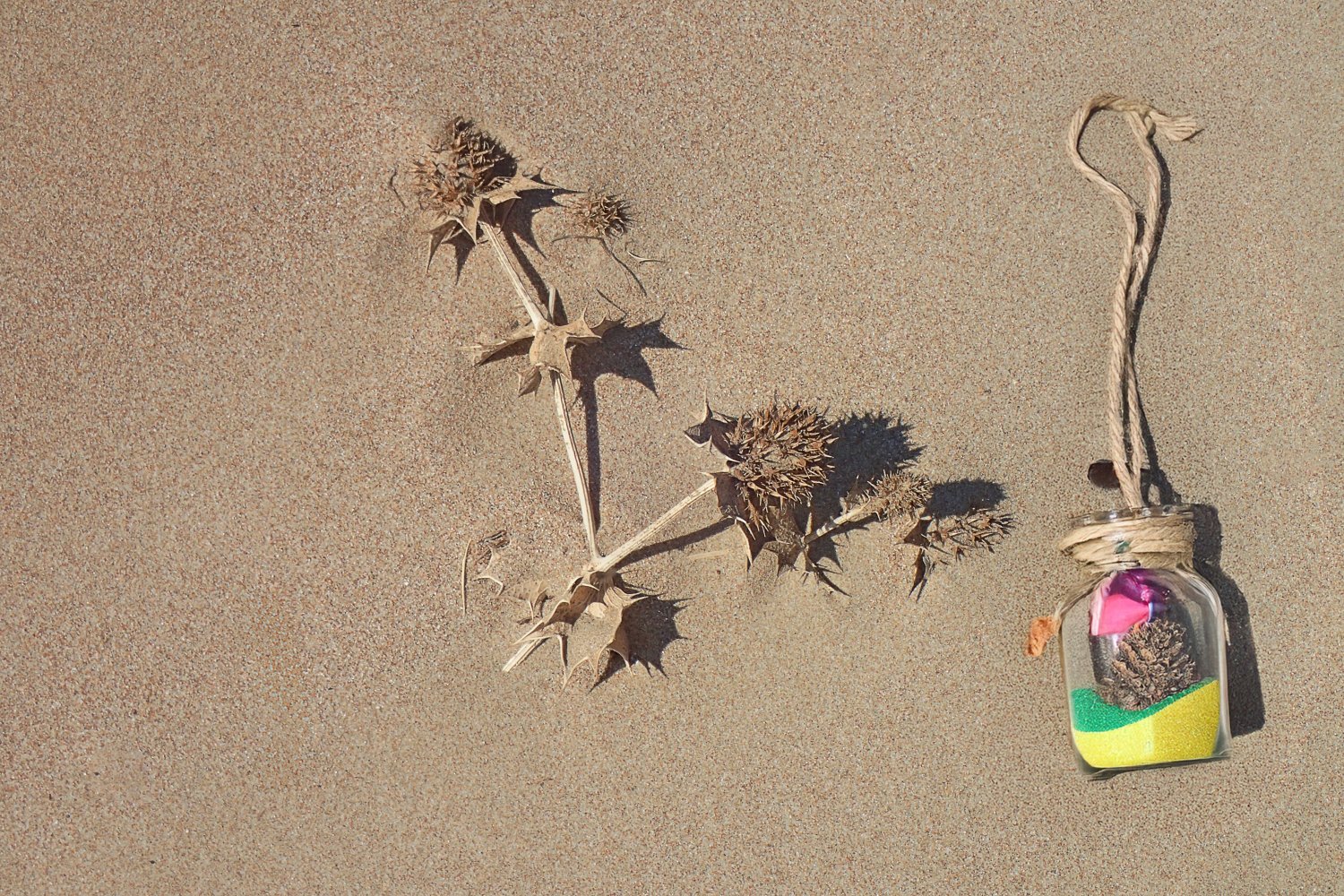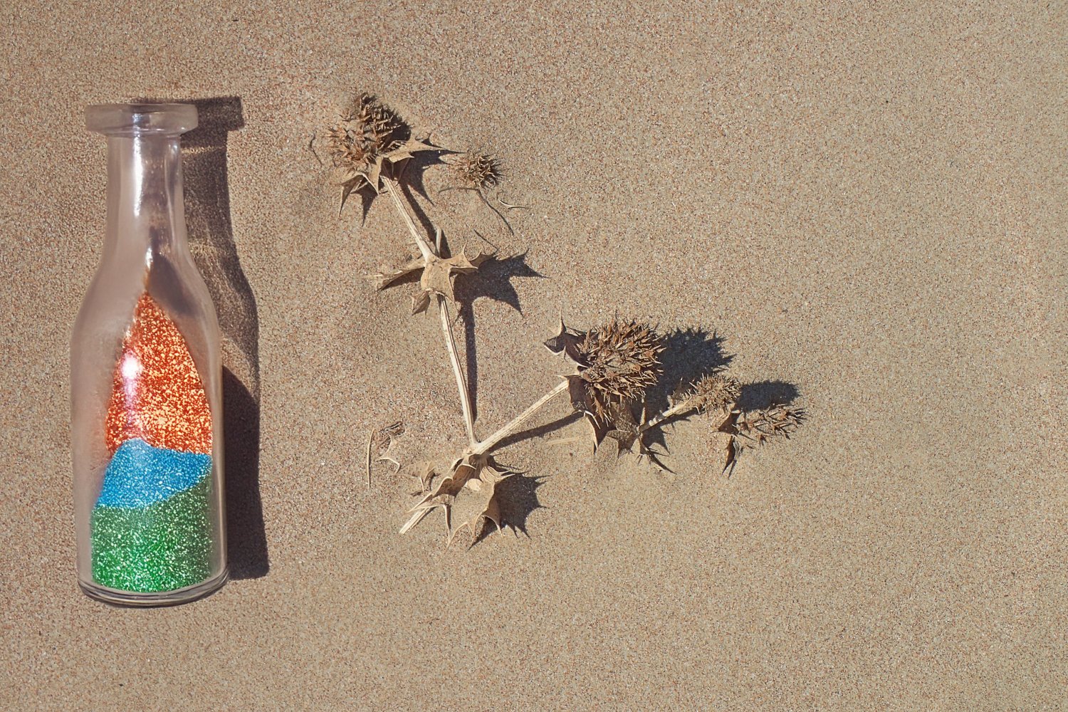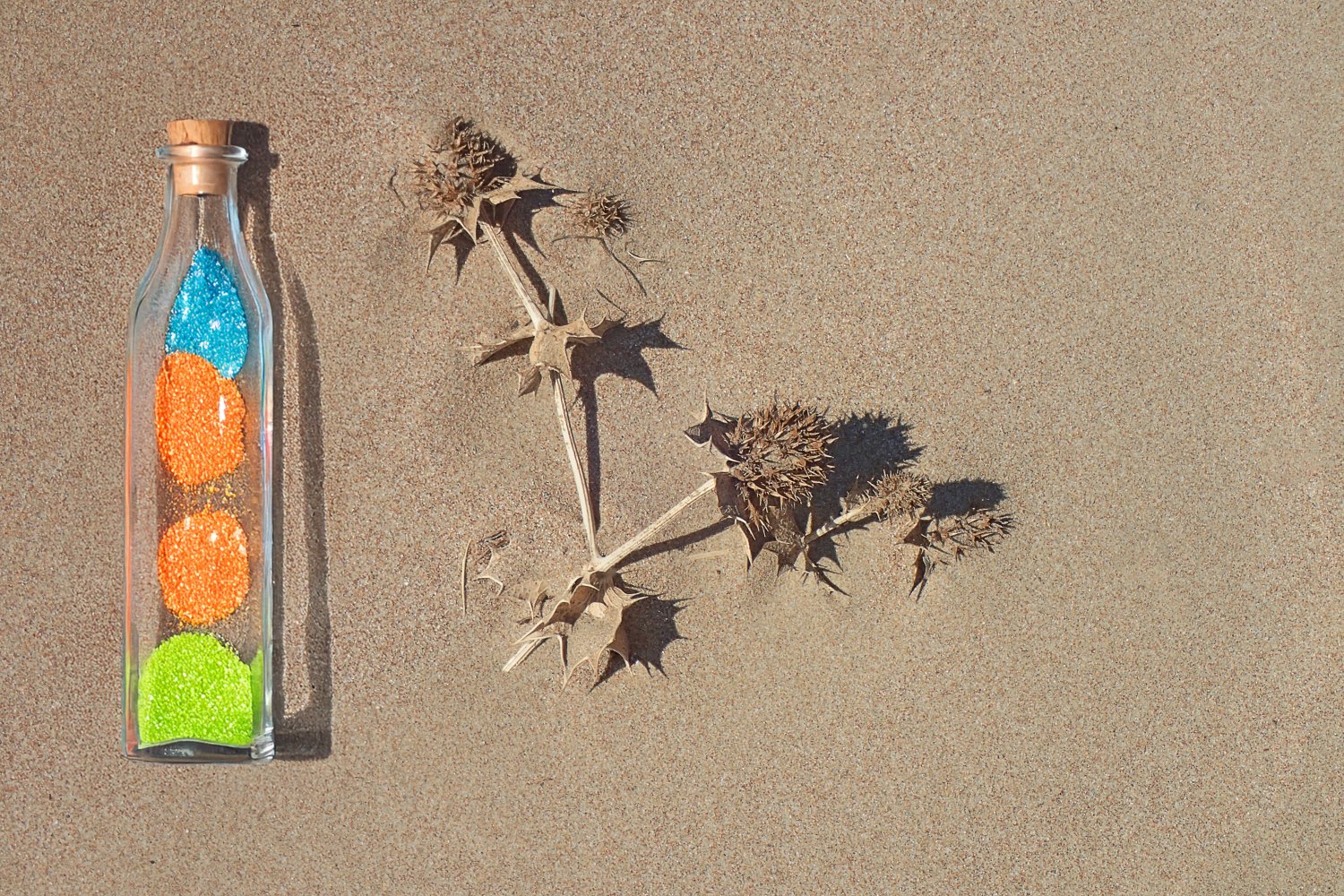 Σε αυτή την προσέγγιση, το φόντο της άμμου τονίζει και αναδεικνύει τα ζωηρά χρώματα των μπουκαλιών, ενώ τα ξερά φύλλα προσδίδουν φυσικότητα και αισθητική θερμότητα στη συνολική εικόνα.