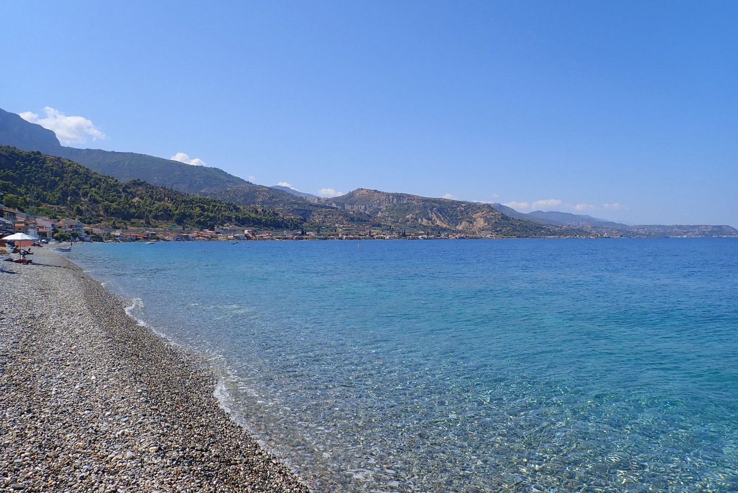 Η παραλία έχει αστικό χαρακτήρα, βρίσκεται ακριβώς μπροστά στον οικισμό και συγκεντρώνει πολύ κόσμο τους καλοκαιρινούς μήνες, ιδιαίτερα Σαββατοκύριακα. Υπάρχουν αρμυρίκια που προσφέρουν φυσική σκιά, ενώ η θέα προς τον Κορινθιακό είναι ανοιχτή.
