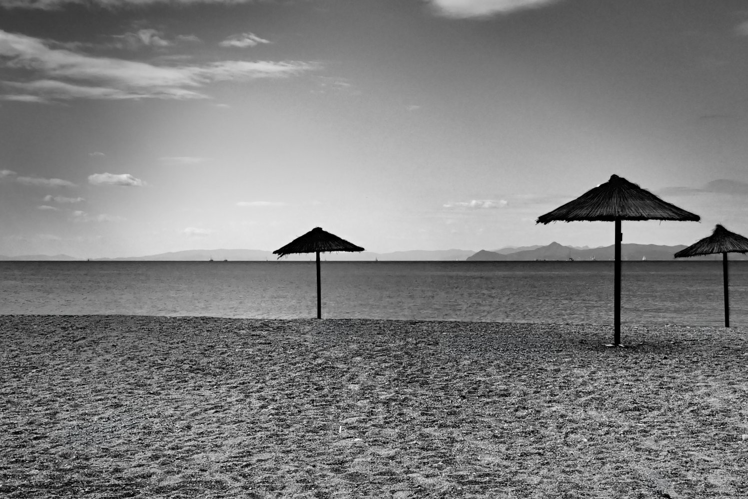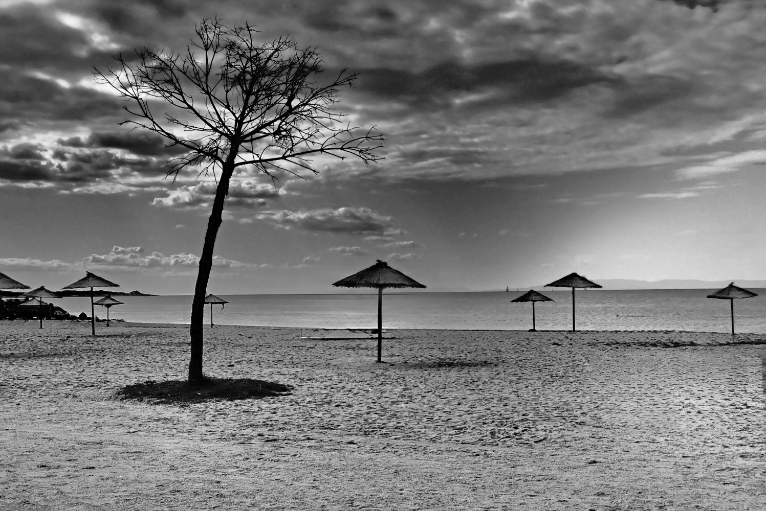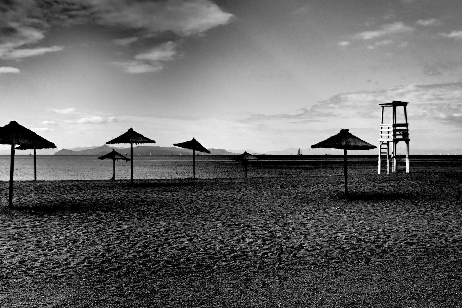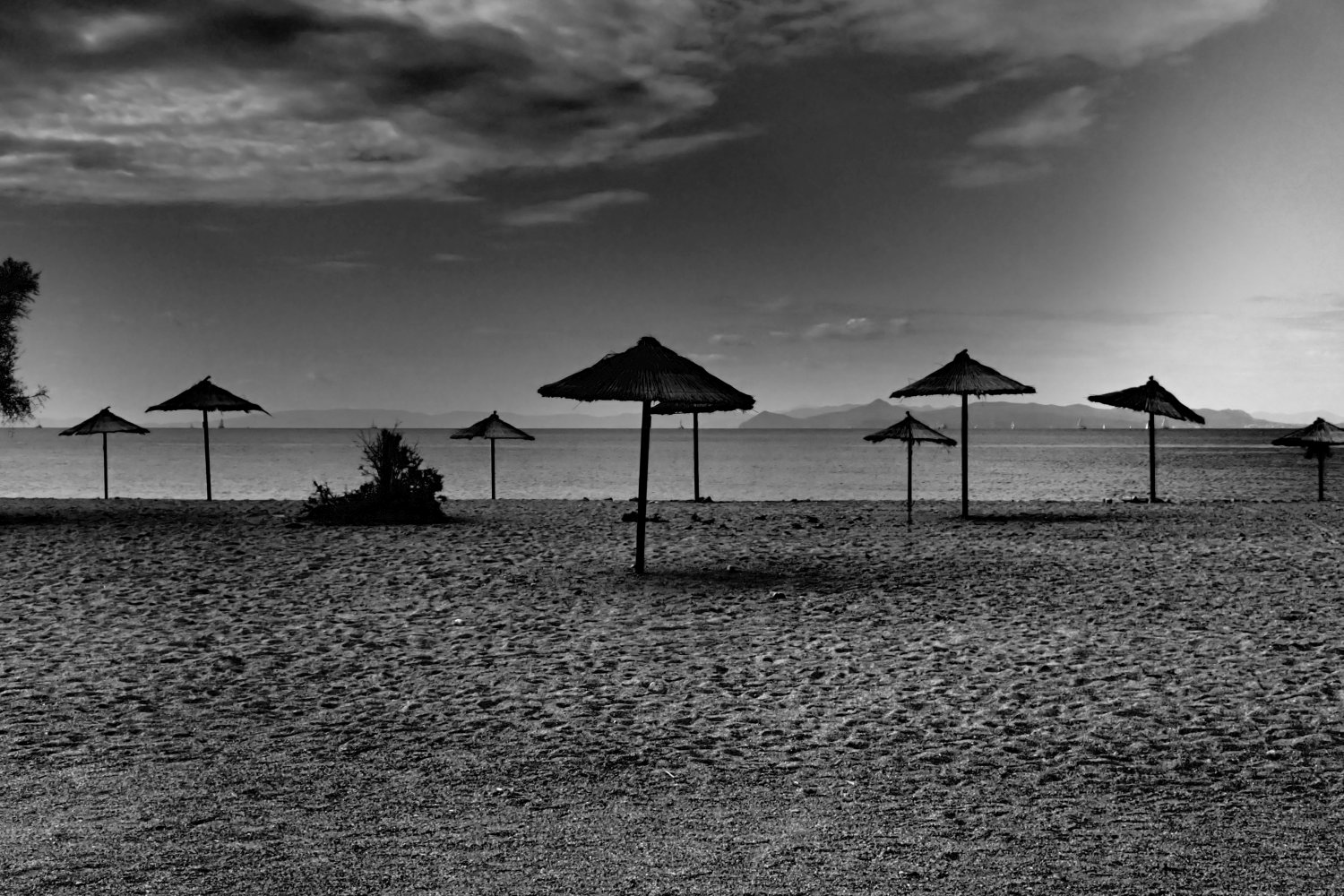 Η παραλία αλλάζει ρυθμό, χάνει τους ανθρώπους κάτω από τις ομπρέλες και η θάλασσα παίρνει πιο σκούρο χρώμα. Ο αέρας γίνεται δροσερός, οι γραμμές του ορίζοντα καθαρίζουν και ο ήχος των κυμάτων δίνει ρυθμό στην απαλή κίνηση του τοπίου. Ο ήλιος χαμηλώνει και φωτίζει τα σύννεφα, δίνοντας δραματικό ύφος στον ουρανό.