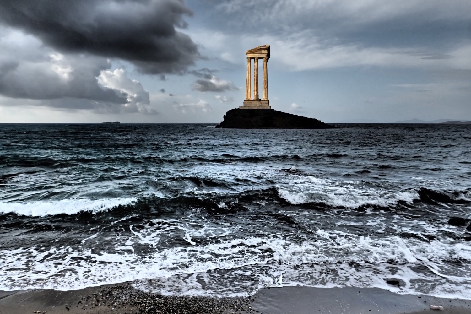 Απεικόνιση αρχαίων κιόνων πάνω σε νησίδα, με φόντο μια φωτογραφία από κινητό τηλέφωνο και κίονες δημιουργημένους με τεχνητή νοημοσύνη. Οι φωτογραφίες δείχνουν πόσο εύκολα μπορούν να ανασυντεθούν αρχιτεκτονικές μορφές με απλά και ελεύθερα μέσα, χωρίς εξοπλισμό ή κόστος. Μέσα από τη συνύπαρξη πραγματικού τοπίου και ψηφιακής σύνθεσης προβάλλεται μια νέα, φανταστική χρήση της αρχαίας αρχιτεκτονικής — όχι ως πιστή αναπαράσταση, αλλά ως πεδίο δημιουργικού πειραματισμού.