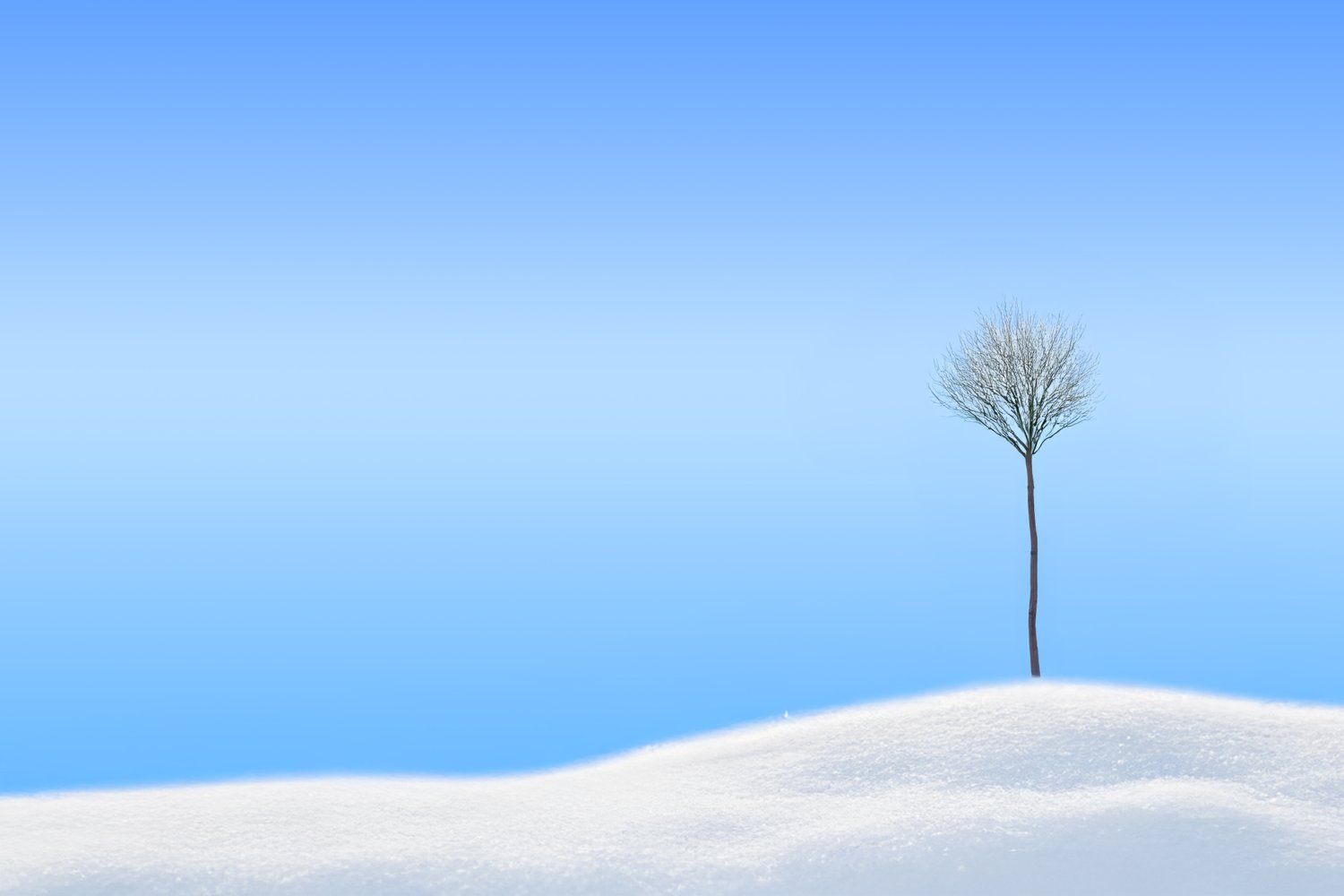 Το γαλάζιο και το άσπρο συγκροτούν έναν χώρο ήσυχο και ανοιχτό, χωρίς ένταση και χωρίς συσσώρευση. Μέσα σε αυτόν, το δέντρο στέκεται ως κάτι πραγματικό, με κορμό, με κατεύθυνση, με ίχνη ζωής. Η χαρά γεννιέται από την αναγνώριση της παρουσίας του, από το απλό γεγονός ότι κάτι ζει και φαίνεται.