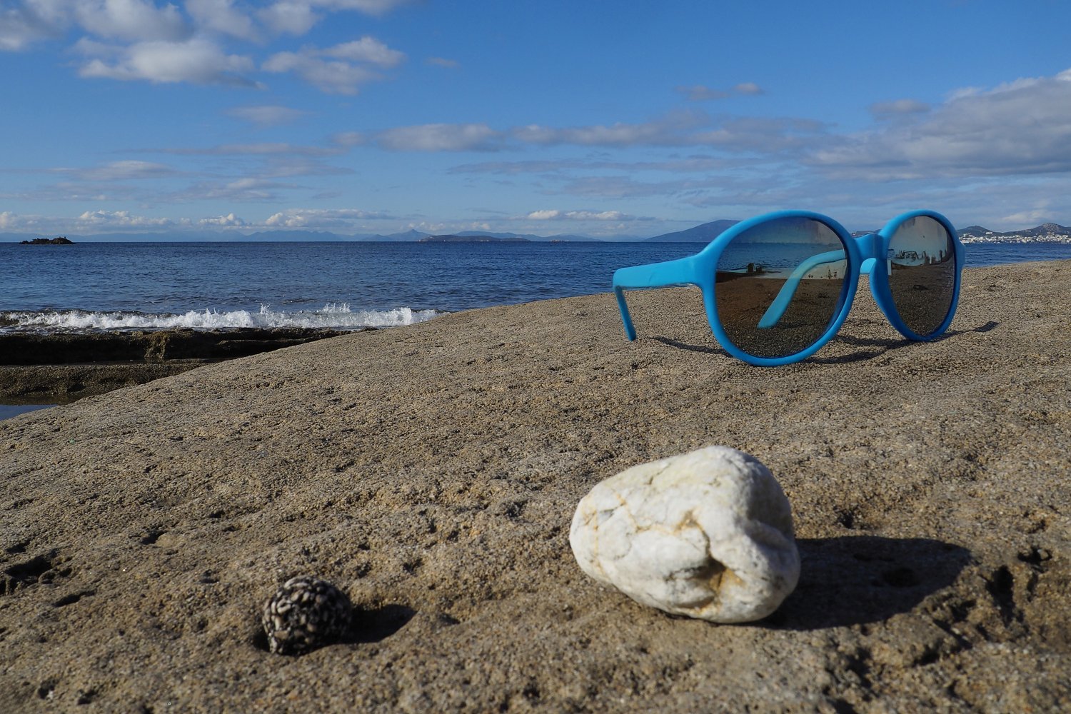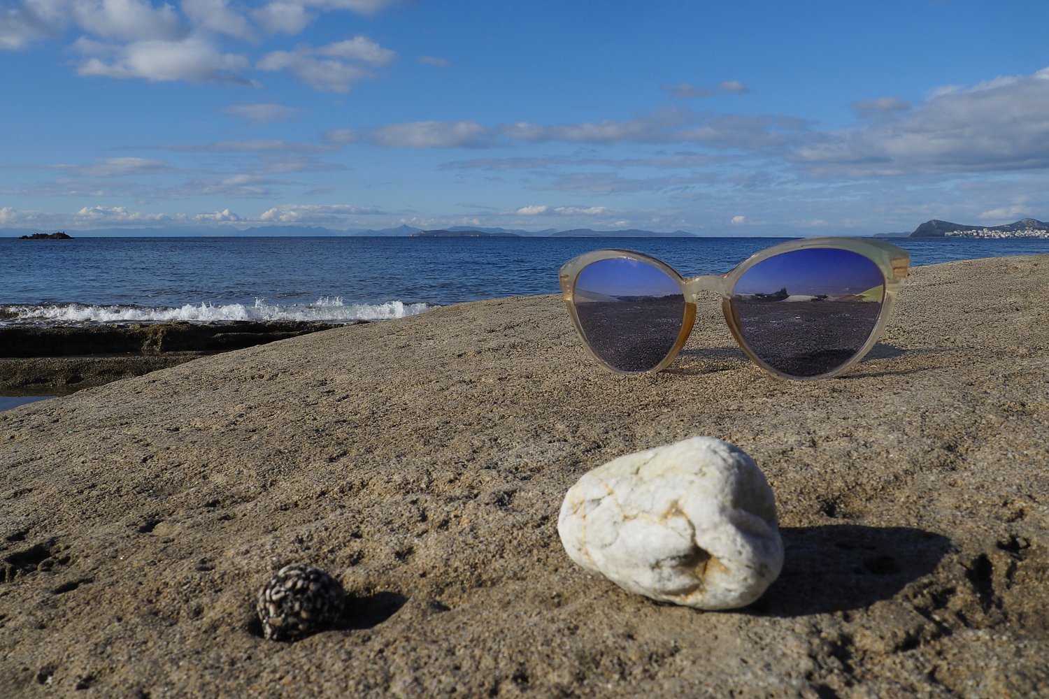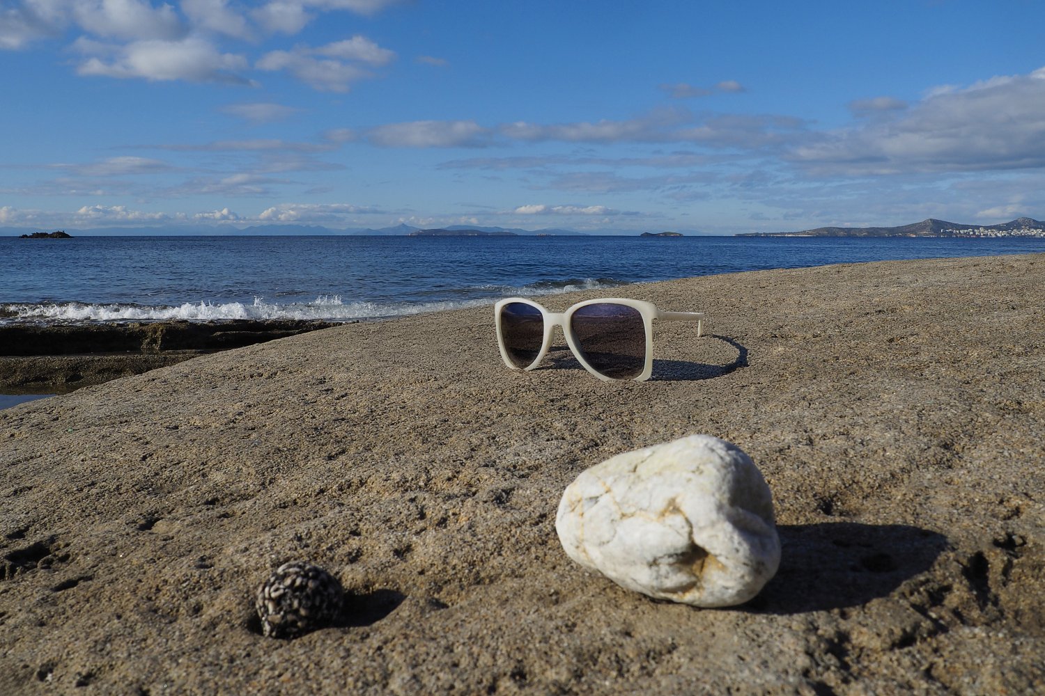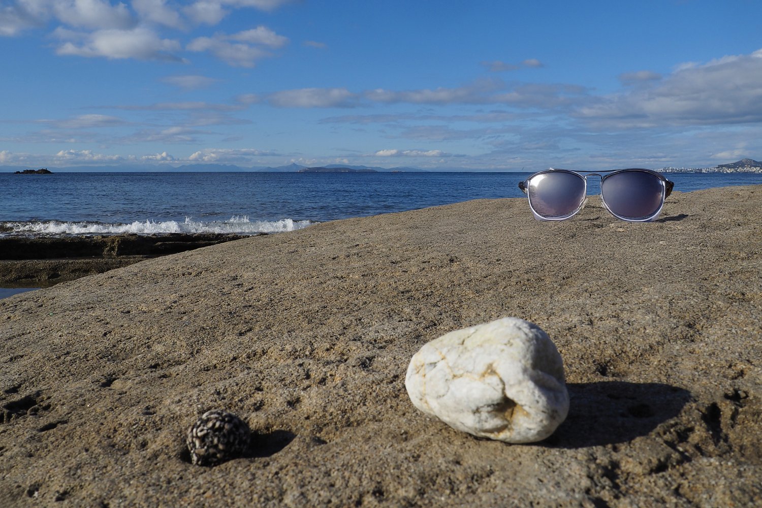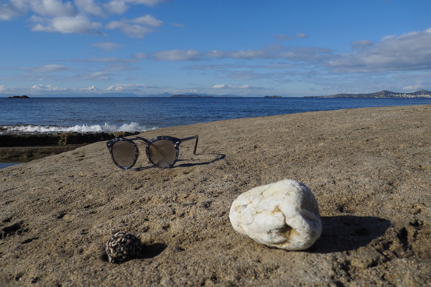 Με μια απλή φωτογραφία τραβηγμένη από κινητό, που λειτουργεί ως background, και με τη βοήθεια της AI, δημιουργούμε εικόνες προβολής γυαλιών ηλίου με τρόπο άμεσο, οικονομικό και πλήρως DIY. Η επιφάνεια του βράχου, η θάλασσα και το φυσικό φως συνθέτουν ένα αυθεντικό περιβάλλον, μέσα στο οποίο το προϊόν ενσωματώνεται οργανικά και πειστικά. Ο βράχος λειτουργεί ως φυσική βάση, ενισχύοντας την αίσθηση ρεαλισμού και σταθερότητας.