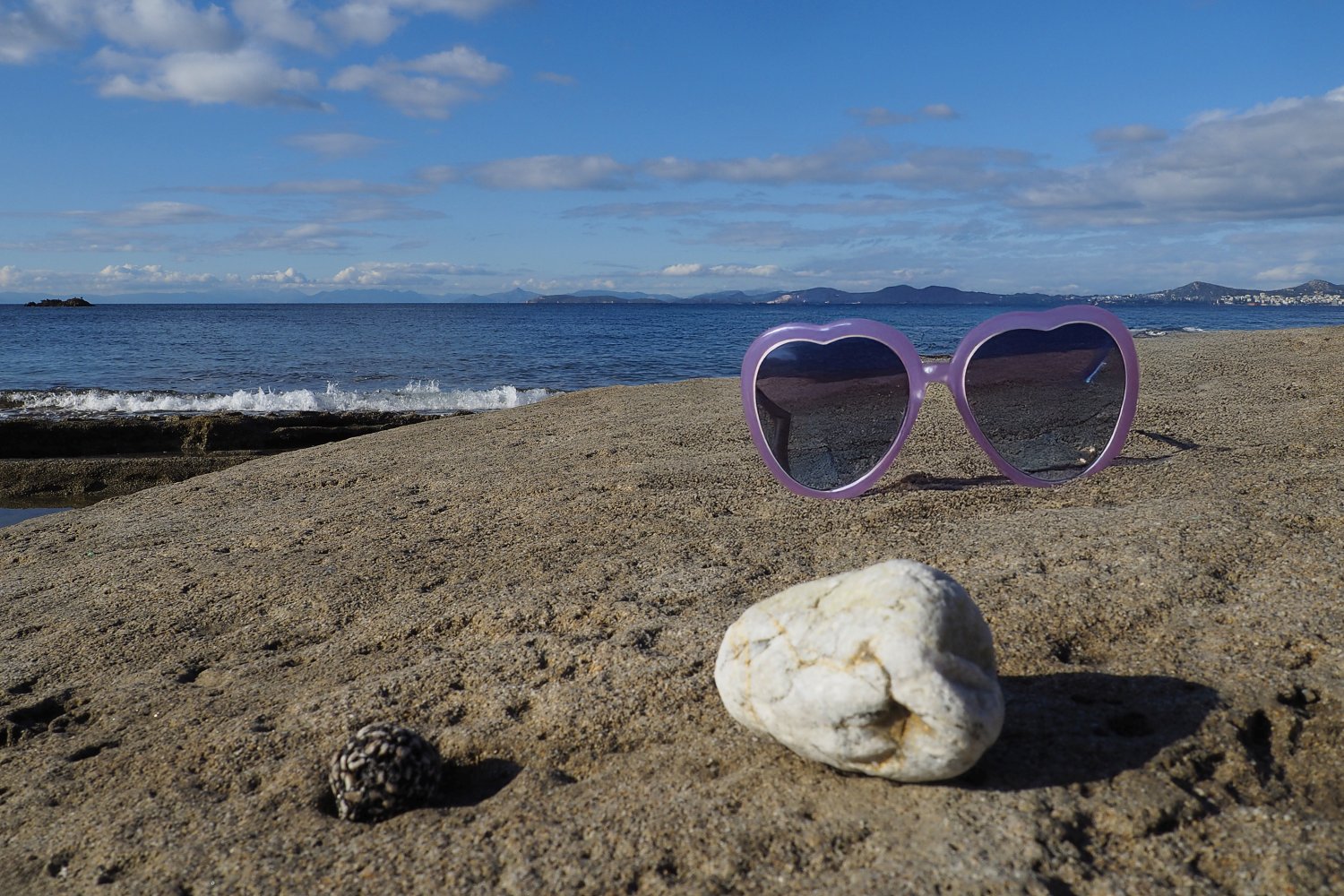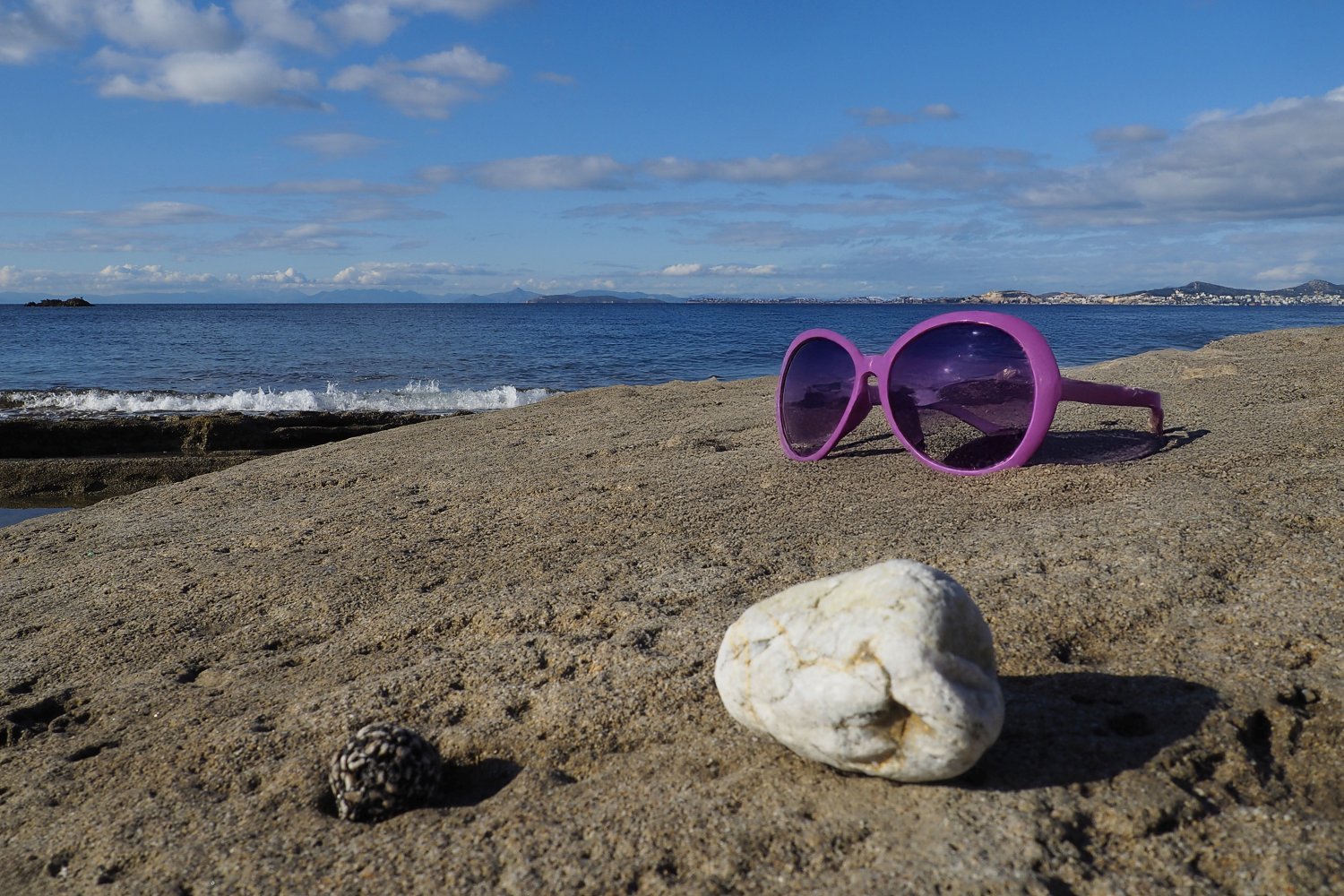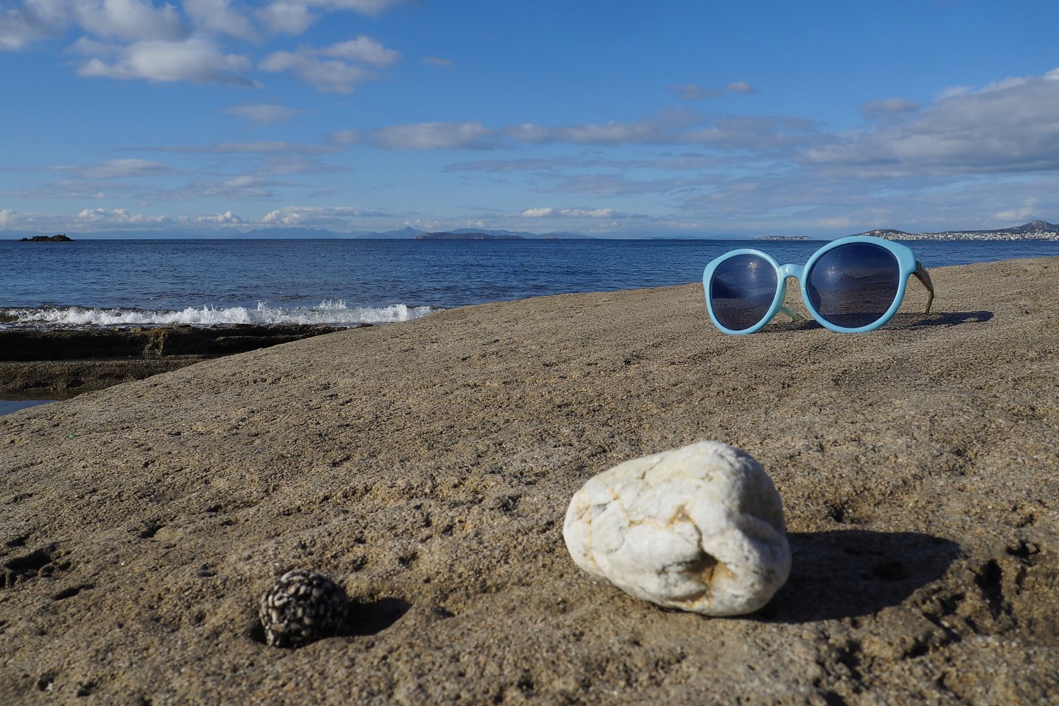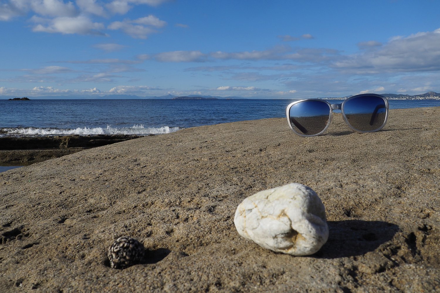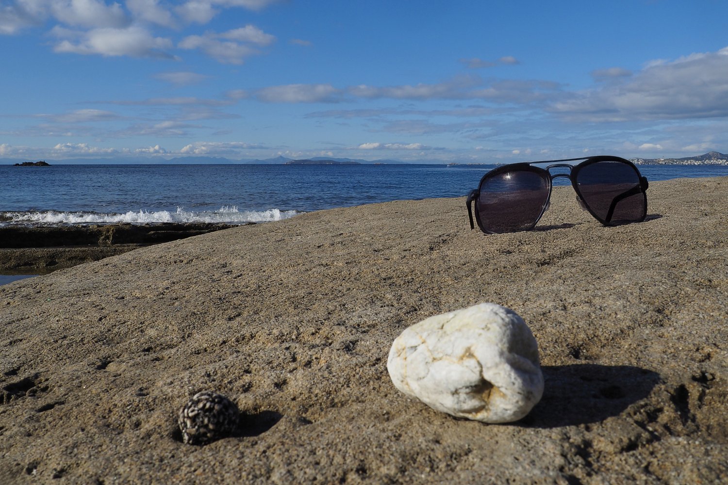 Με μια απλή φωτογραφία τραβηγμένη από κινητό, που λειτουργεί ως background, και με τη βοήθεια της AI, δημιουργούμε εικόνες προβολής γυαλιών ηλίου με τρόπο άμεσο, οικονομικό και πλήρως DIY. Η επιφάνεια του βράχου, η θάλασσα και το φυσικό φως συνθέτουν ένα αυθεντικό περιβάλλον, μέσα στο οποίο το προϊόν ενσωματώνεται οργανικά και πειστικά. Ο βράχος λειτουργεί ως φυσική βάση, ενισχύοντας την αίσθηση ρεαλισμού και σταθερότητας.