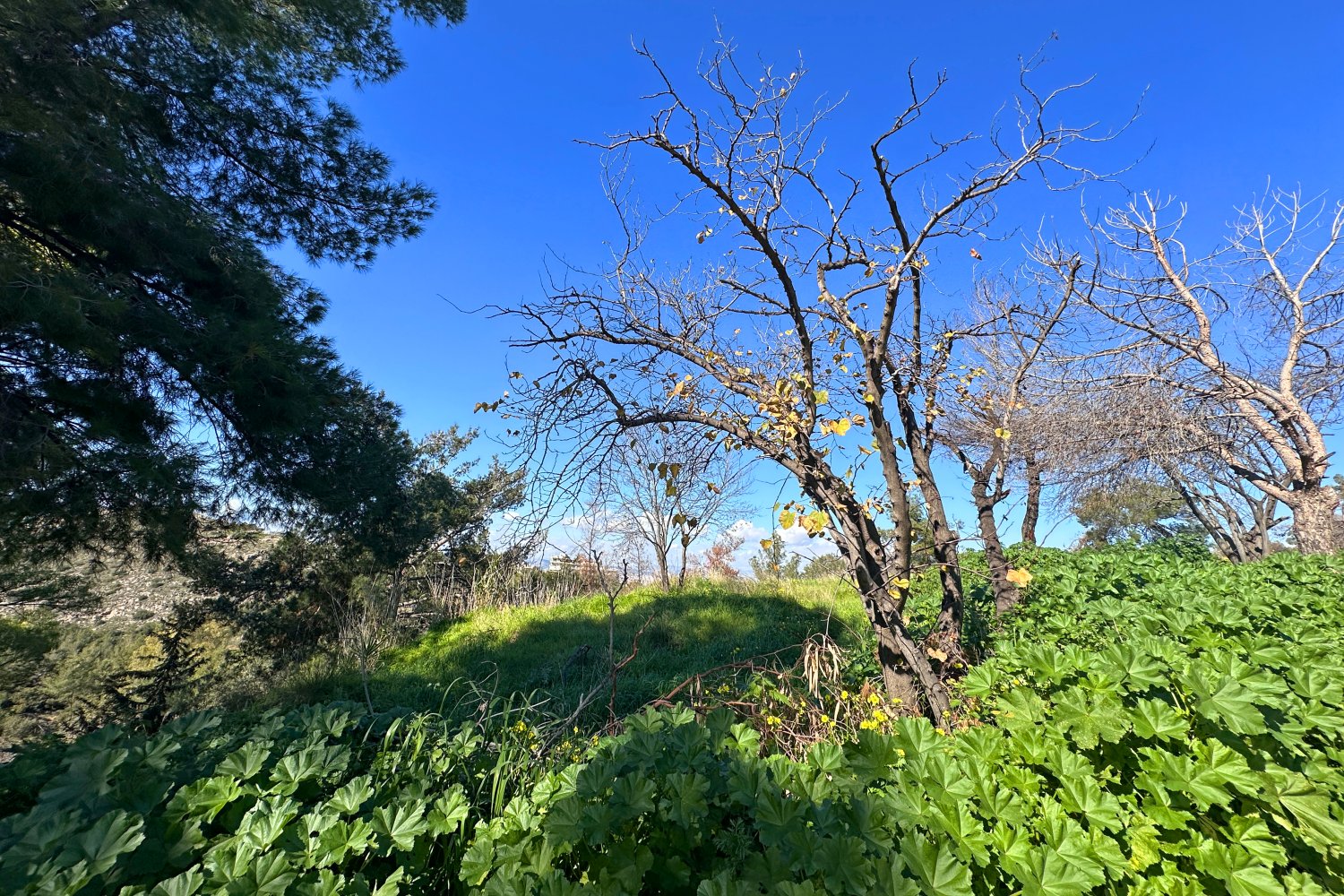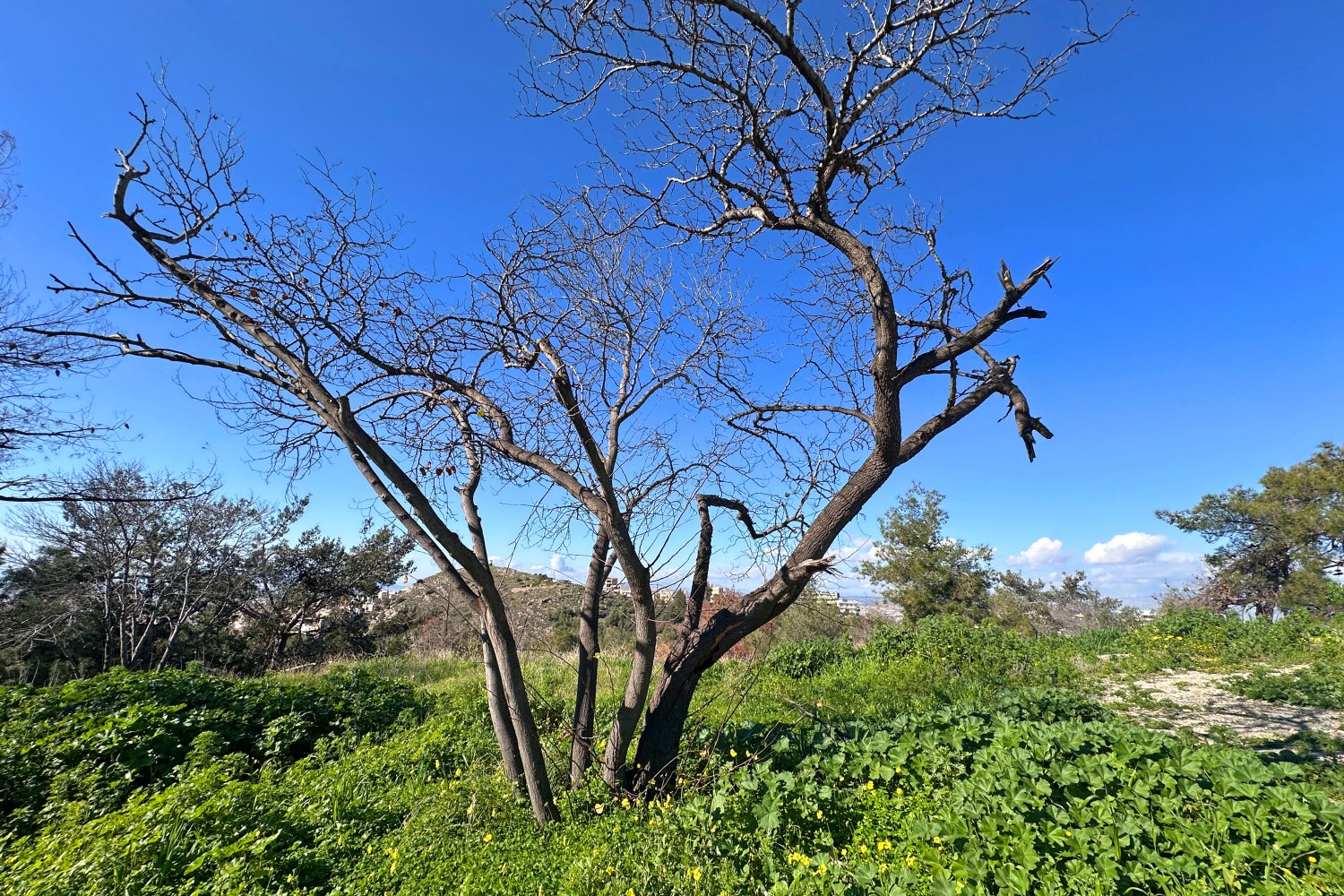 Η αποχώρηση του χειμώνα γίνεται ορατή μέσα από την αντίθεση ανάμεσα στα γυμνά δέντρα, το έντονο φως του ήλιου και το πράσινο έδαφος. Τα δέντρα, ακόμη χωρίς φύλλα, διατηρούν τα σημάδια της ψυχρής περιόδου, ενώ το έδαφος δείχνει ήδη ενεργή βλάστηση και εποχική ανάκαμψη.