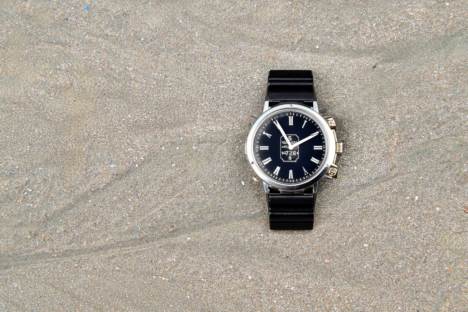 Η λήψη καταγράφει μόνο το περιβάλλον της άμμου. Το ρολόι προστίθεται αργότερα με τη βοήθεια της AI, επιτρέποντας στο ίδιο φόντο να φιλοξενεί διαφορετικά αντικείμενα και να μετατρέπεται σε ολοκληρωμένες διαφημιστικές εικόνες, έτοιμες για χρήση σε social media και καταλόγους.