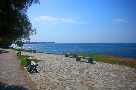 | Παγκάκι με θέα στη θάλασσα, κάτω από τα δέντρα, Βούλα, Αττική |