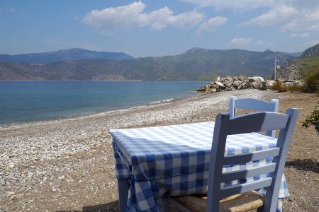 | Ξύλινο τραπέζι δίπλα στο κύμα, Αλεποχώρι, Μέγαρα, Αττική |
