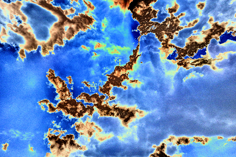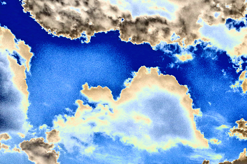 Οι φόρμες και η επιλογή των κορεσμένων χρωμάτων, κάνει τα σύννεφα να δείχνουν σαν στεριές πάνω στη θάλασσα, όπως θα φαίνονταν από ψηλά.