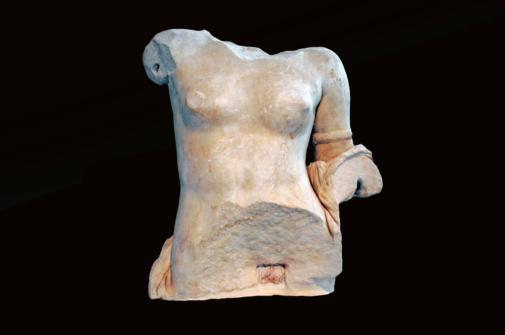 Κορμός Αγάλματος Αφροδίτης. Μάρμαρο Παριανό. Βρέθηκε στην Αθήνα. Η θεά παριστάνεται γυμνή από τη μέση και πάνω. Το κάτω μέρος του σώματος θα ήταν τυλιγμένο με ιμάτιο, η άκρη του οποίου αναδιπλώνεται στο αριστερό της χέρι. Το κάτω μέρος του σώματος και τα χέρια ήταν κατασκευασμένα από ξεχωριστό κομμάτι μαρμάρου.