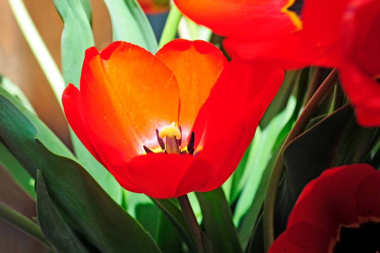 Κομμένες μέσα σε βάζο για να στολίσουν ένα τραπέζι. Ο ήλιος που μπαίνει από το παράθυρο ισοπεδώνει τις λεπτομέρειες στις μορφές των λουλουδιών. Αυτό που μένει είναι μια κυκλική κόκκινη φόρμα που επιπλέει μέσα σε πράσινους βλαστούς και τις σκιές τους.