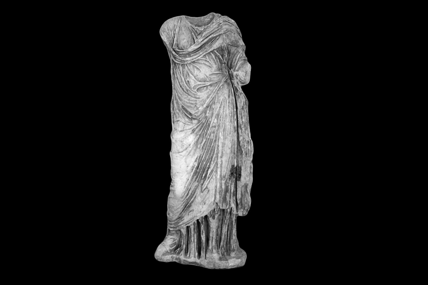 Γυναικείο Ενδεδυμένο άγαλμα. Λείπει το ένθετο κεφάλι. Φέρει χειριδωτό μακρύ χιτώνα και ιμάτιο. Ο τύπος του αγάλματος βασίζεται σε αρχέτυπο του 2ου αιώνα π.Χ. Ρωμαϊκή περίοδος. Ύψος: 169 cm.