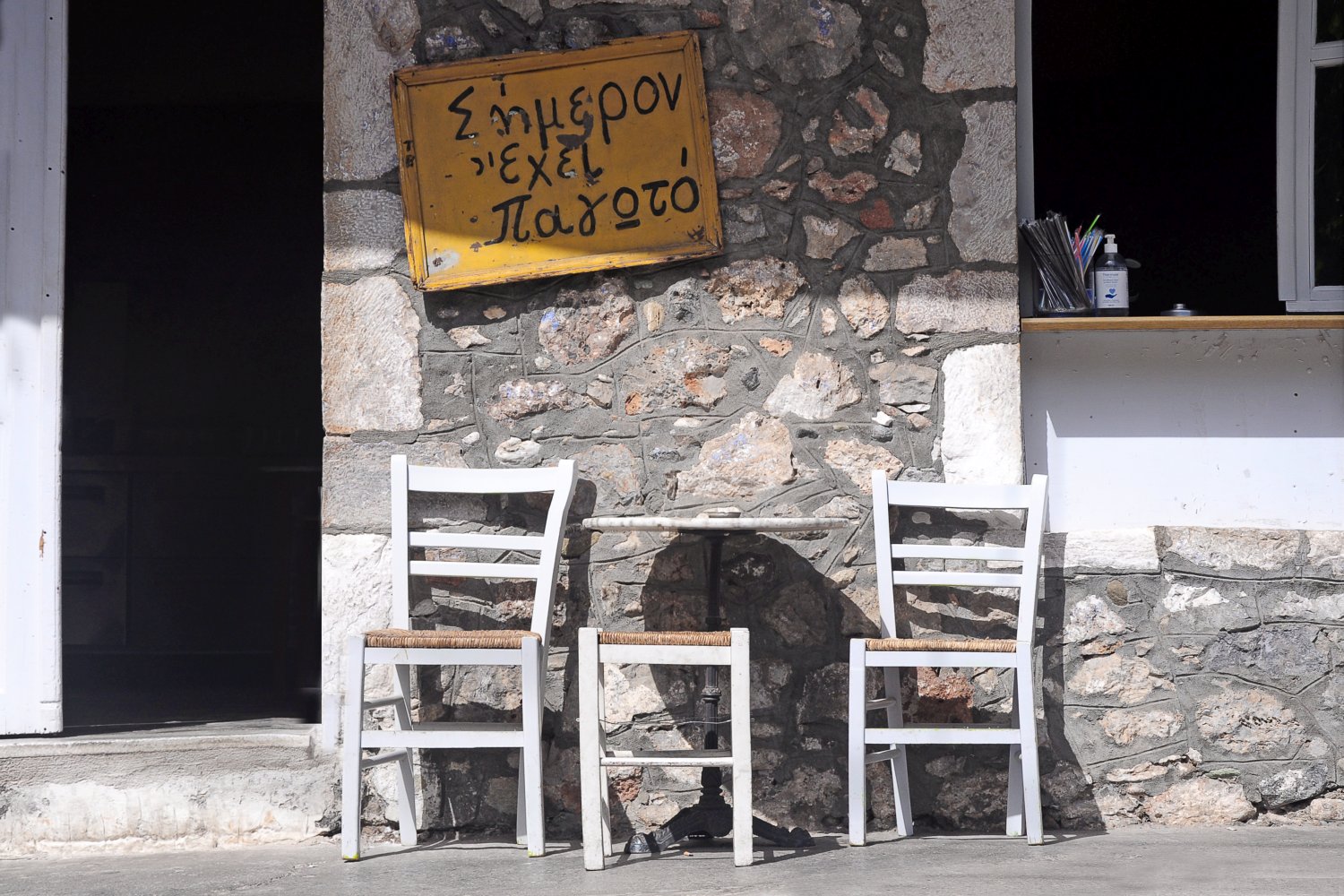 Παραδοσιακό πέτρινο καφενείο με τα τραπεζάκια έξω. Το κατάστημα σήμερον όπως ενημερώνει η ταμπέλα, «έχει παγωτό».