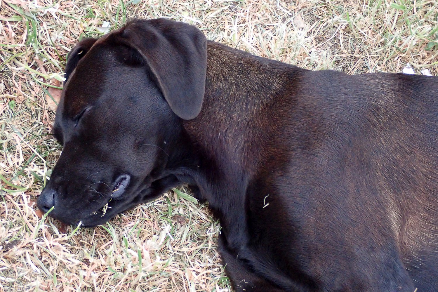 Καφέ σκύλος σε βαθύ ύπνο πάνω στο χορτάρι.