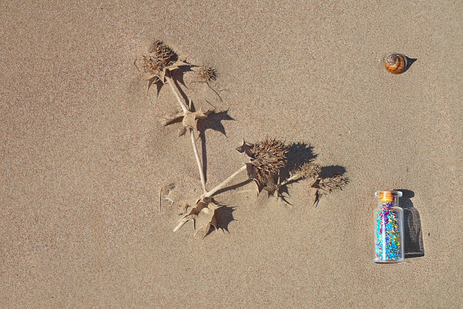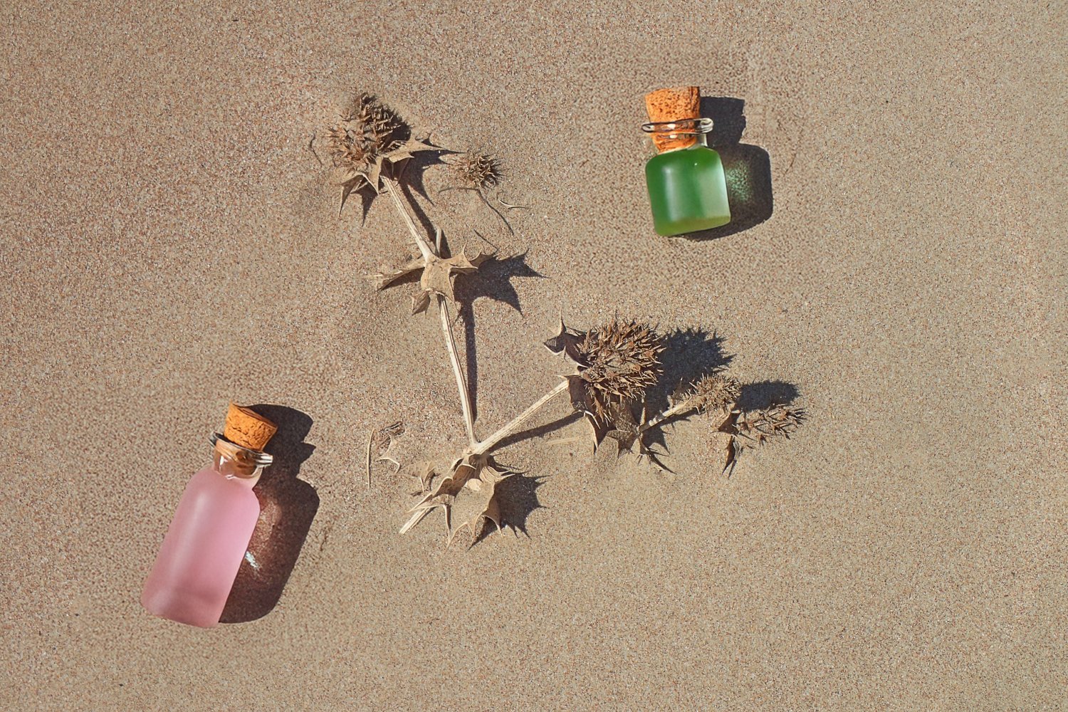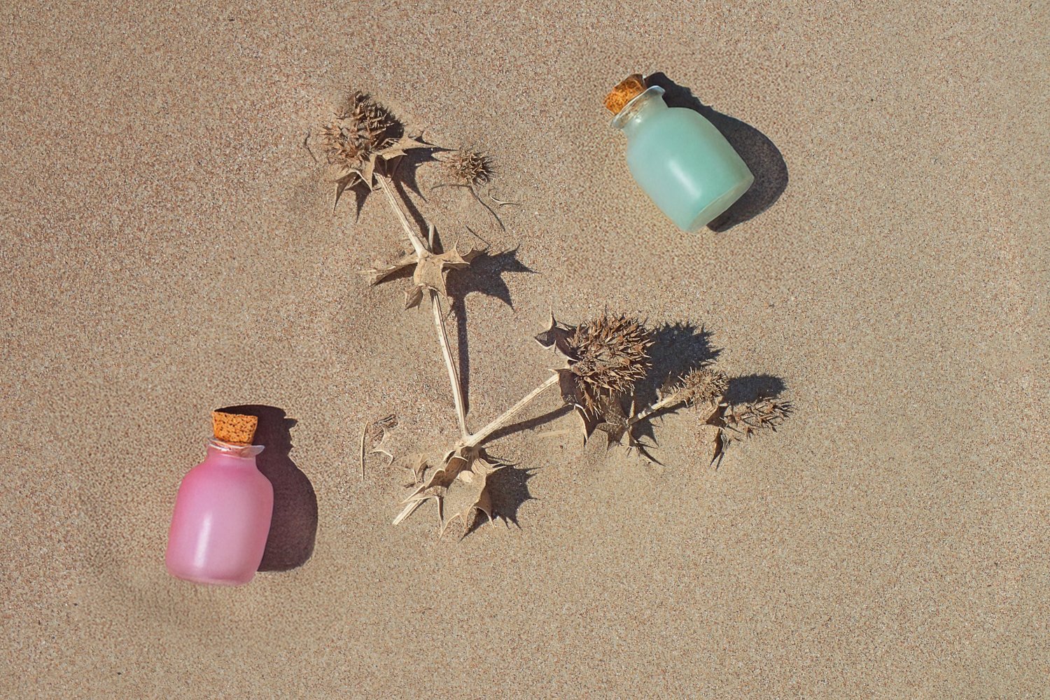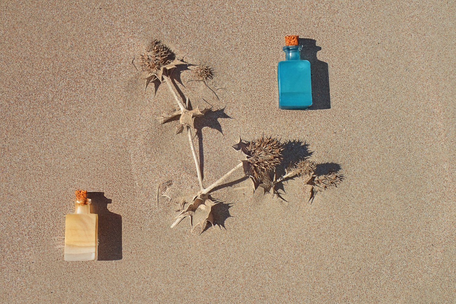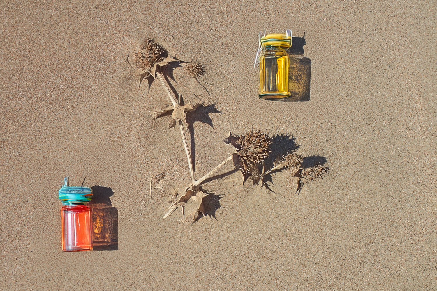 Σε αυτή την προσέγγιση, το φόντο της άμμου τονίζει και αναδεικνύει τα ζωηρά χρώματα των μπουκαλιών, ενώ τα ξερά φύλλα προσδίδουν φυσικότητα και αισθητική θερμότητα στη συνολική εικόνα.
