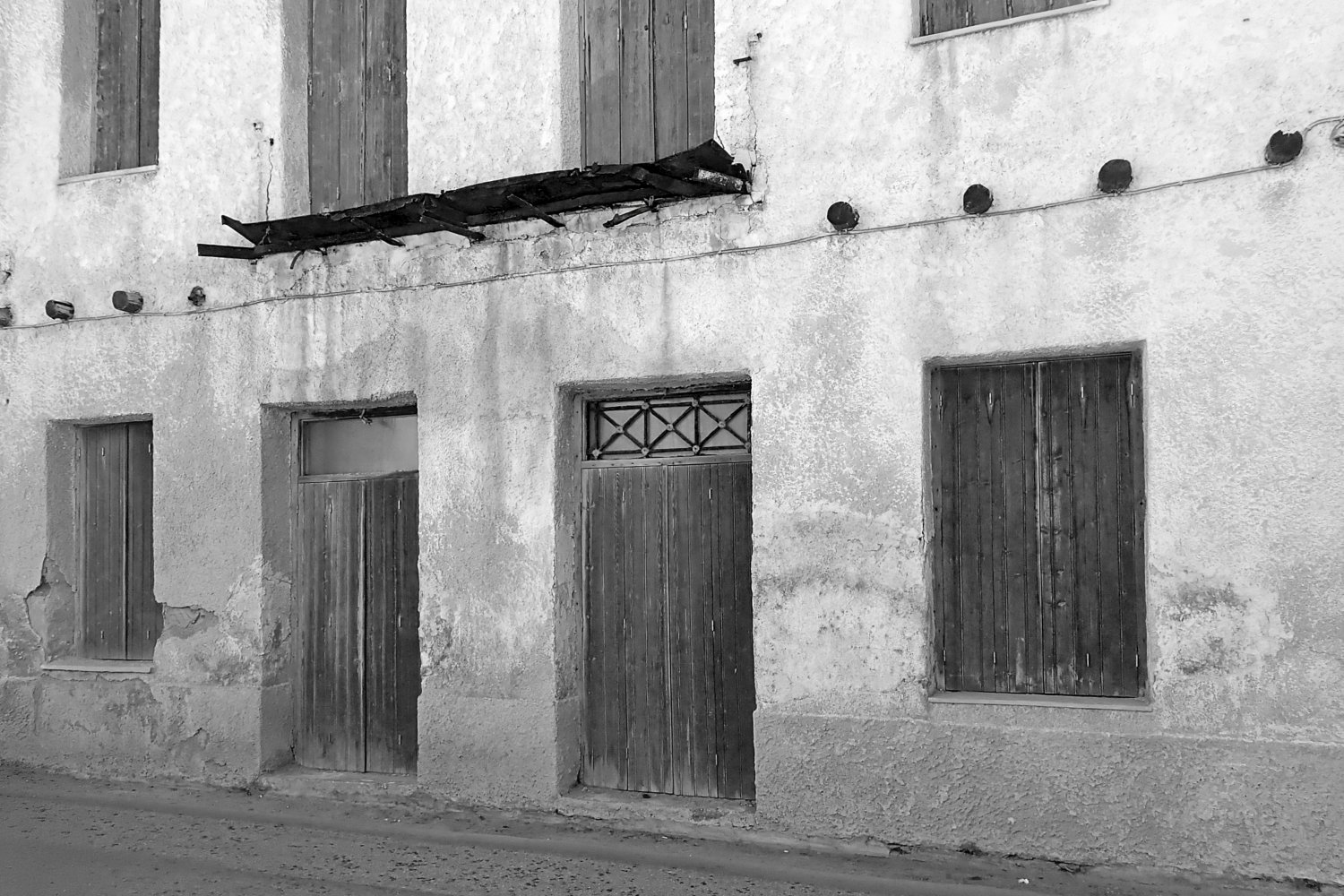 Ξύλινες πόρτες και παράθυρα σε πρόσοψη παλιού κτηρίου, Δερβένι, Κορινθία