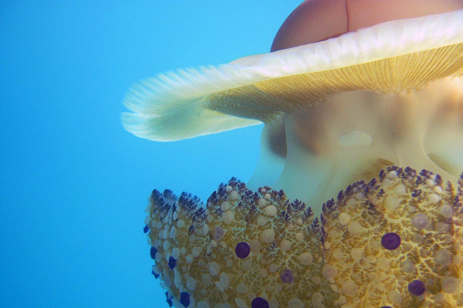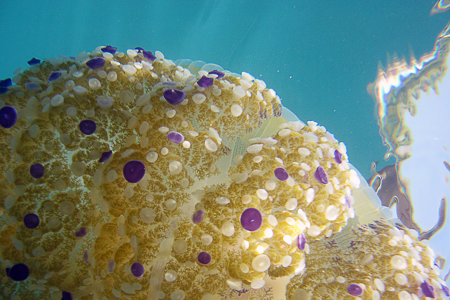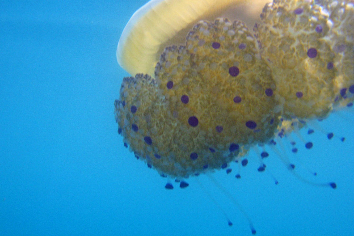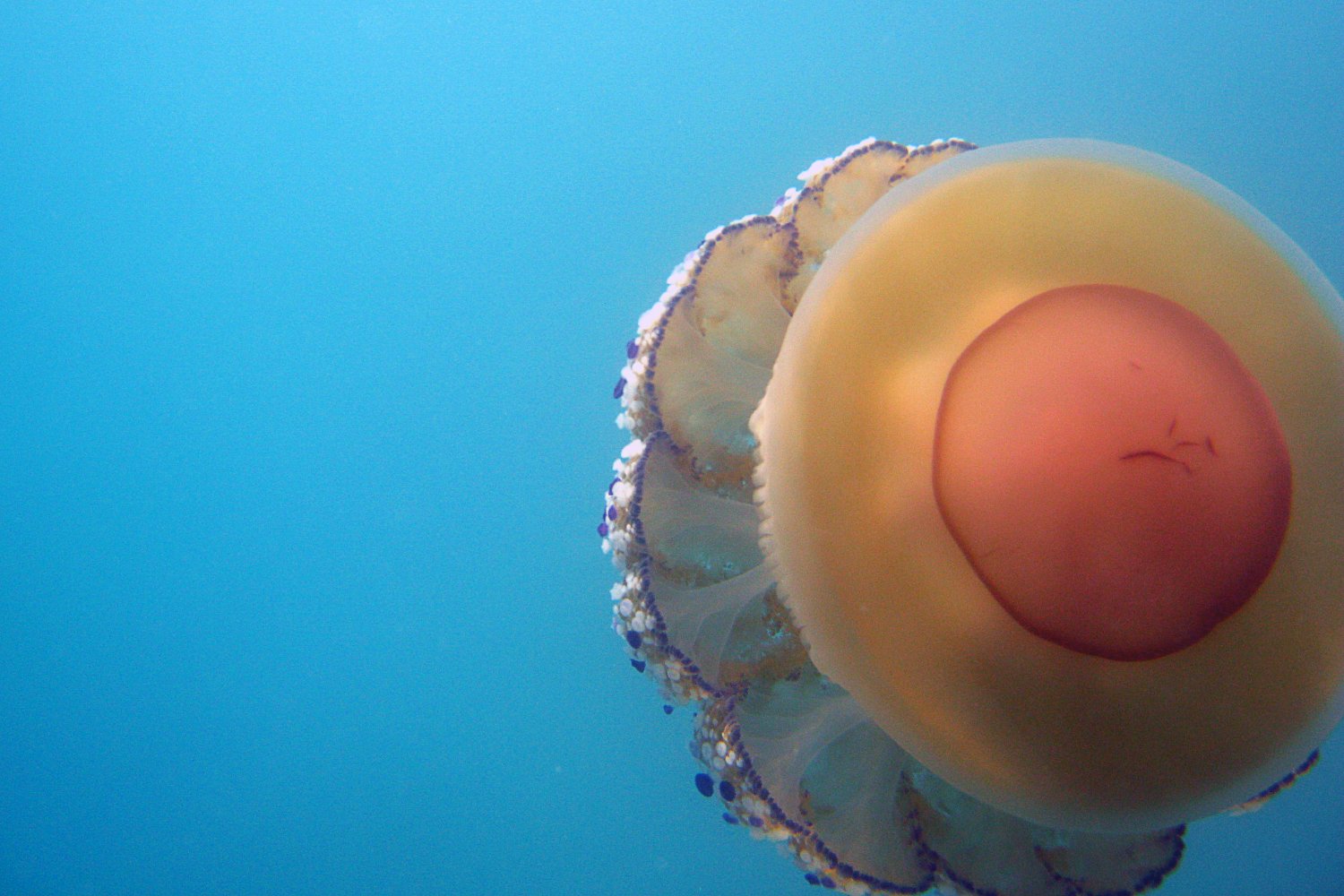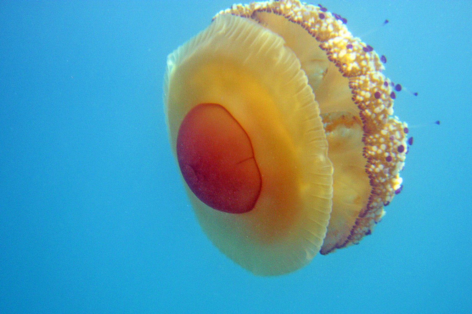 Οι μέδουσες ανήκουν στο είδος Cotylorhiza tuberculata, γνωστό ως μέδουσα-αυγό τηγανητό. Πρόκειται για είδος της Μεσογείου, που χαρακτηρίζεται από τον μεγάλο, κυκλικό δίσκο και τις σφαιρικές προεκτάσεις με συμβιωτικά φύκη του γένους Symbiodinium. Αυτά τα φύκη επιτρέπουν στη μέδουσα να αξιοποιεί την ηλιακή ενέργεια, γεγονός που μειώνει την ανάγκη της για θήρα άλλων οργανισμών.