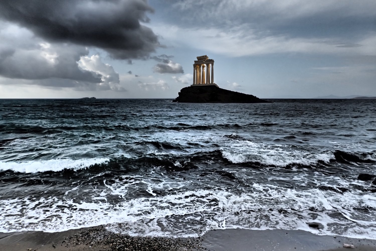 Απεικόνιση αρχαίων κιόνων πάνω σε νησίδα, με φόντο μια φωτογραφία από κινητό τηλέφωνο και κίονες δημιουργημένους με τεχνητή νοημοσύνη. Οι φωτογραφίες δείχνουν πόσο εύκολα μπορούν να ανασυντεθούν αρχιτεκτονικές μορφές με απλά και ελεύθερα μέσα, χωρίς εξοπλισμό ή κόστος. Μέσα από τη συνύπαρξη πραγματικού τοπίου και ψηφιακής σύνθεσης προβάλλεται μια νέα, φανταστική χρήση της αρχαίας αρχιτεκτονικής — όχι ως πιστή αναπαράσταση, αλλά ως πεδίο δημιουργικού πειραματισμού.