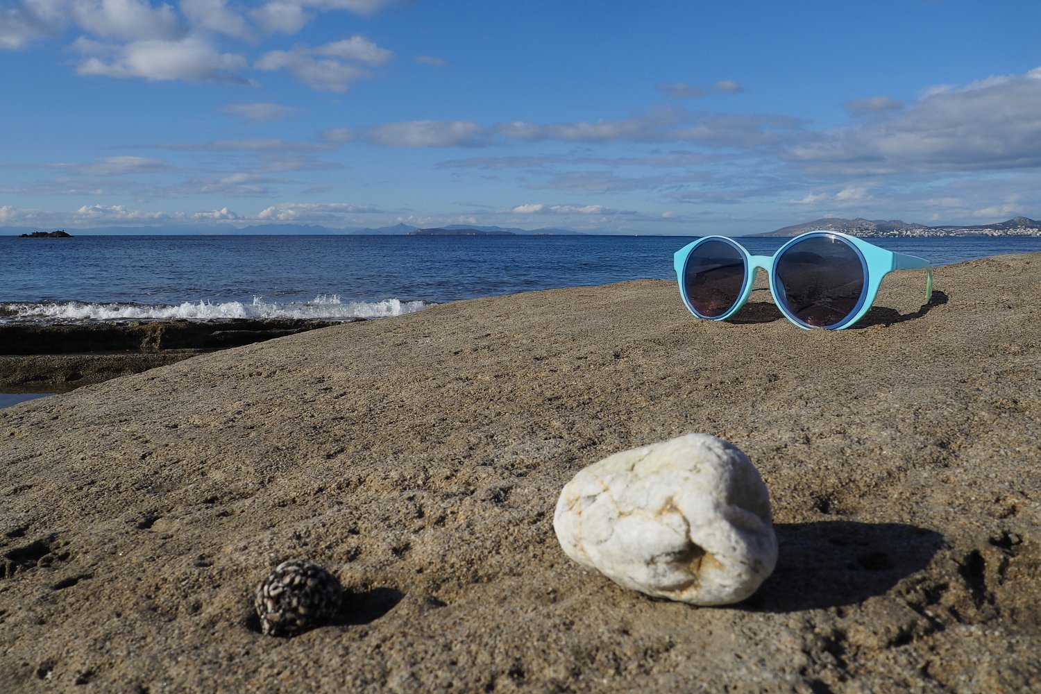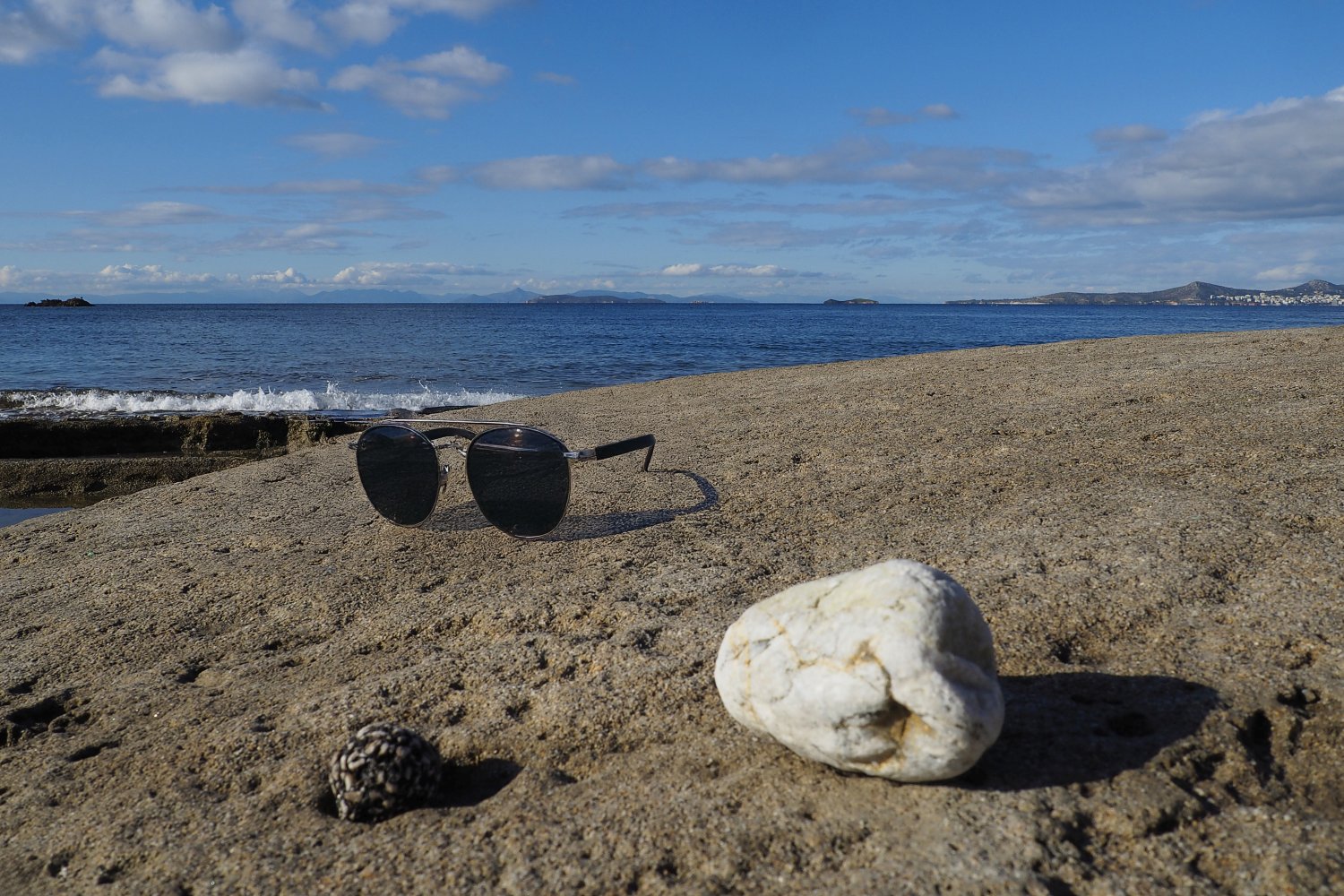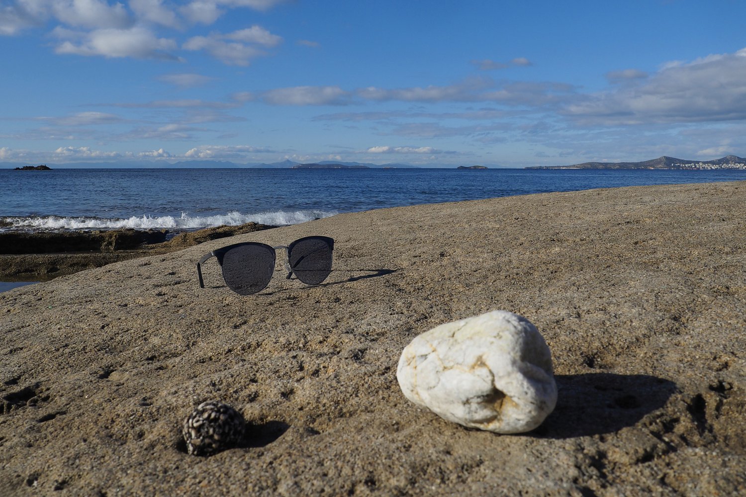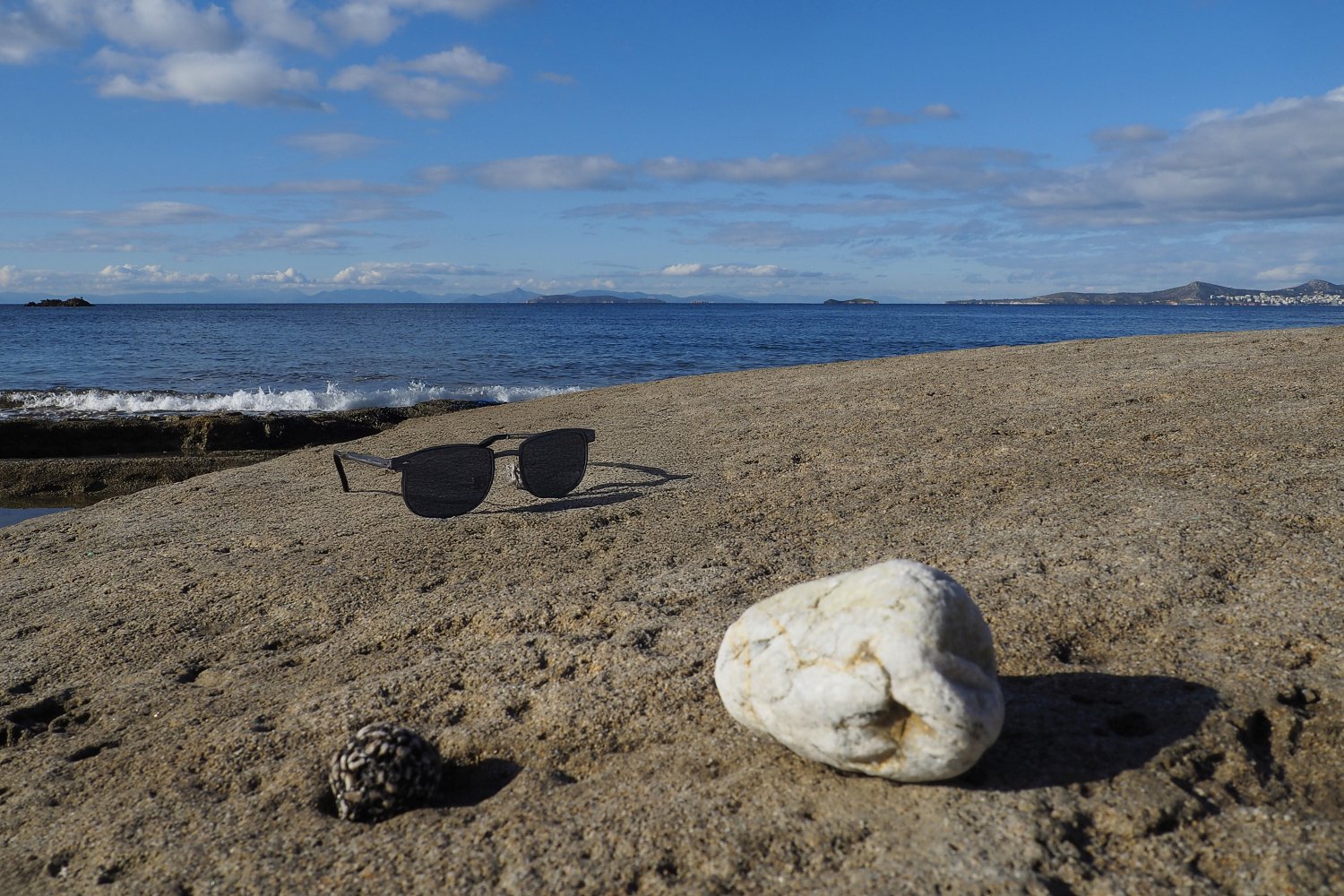 Με μια απλή φωτογραφία τραβηγμένη από κινητό, που λειτουργεί ως background, και με τη βοήθεια της AI, δημιουργούμε εικόνες προβολής γυαλιών ηλίου με τρόπο άμεσο, οικονομικό και πλήρως DIY. Η επιφάνεια του βράχου, η θάλασσα και το φυσικό φως συνθέτουν ένα αυθεντικό περιβάλλον, μέσα στο οποίο το προϊόν ενσωματώνεται οργανικά και πειστικά. Ο βράχος λειτουργεί ως φυσική βάση, ενισχύοντας την αίσθηση ρεαλισμού και σταθερότητας.