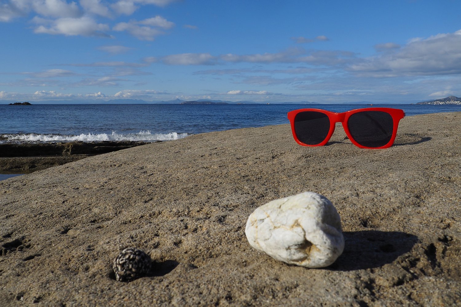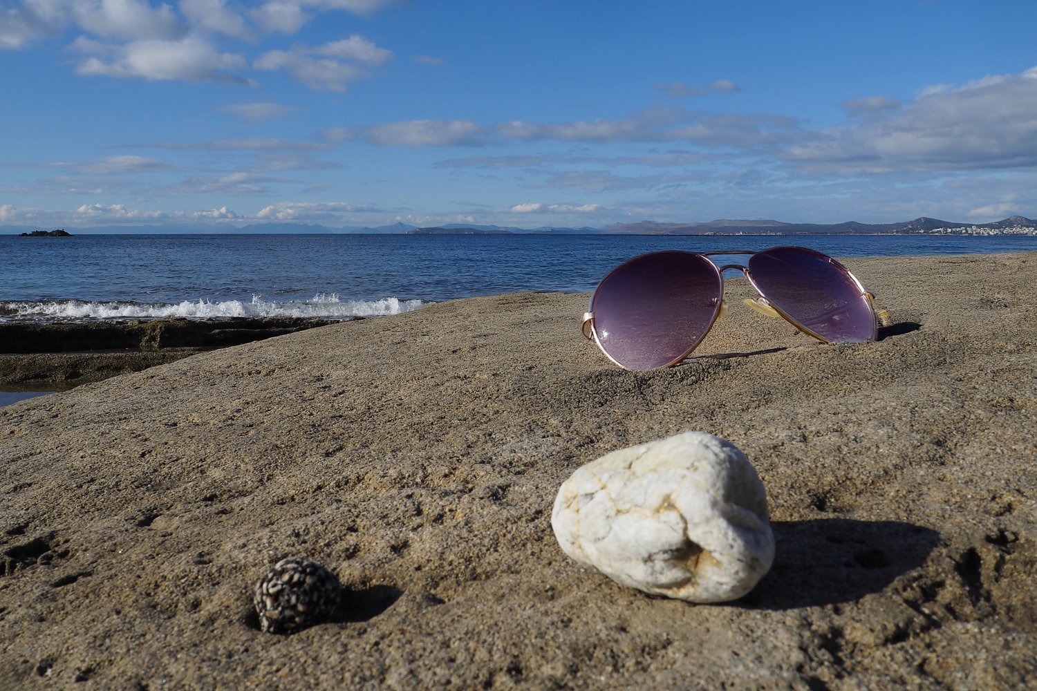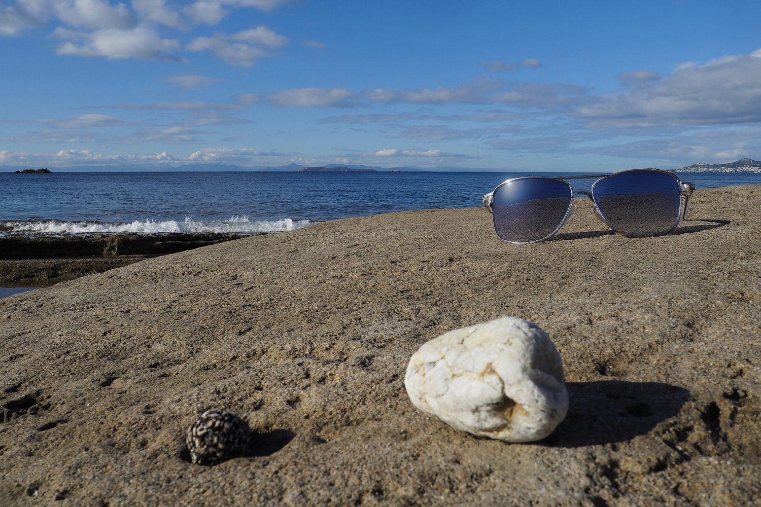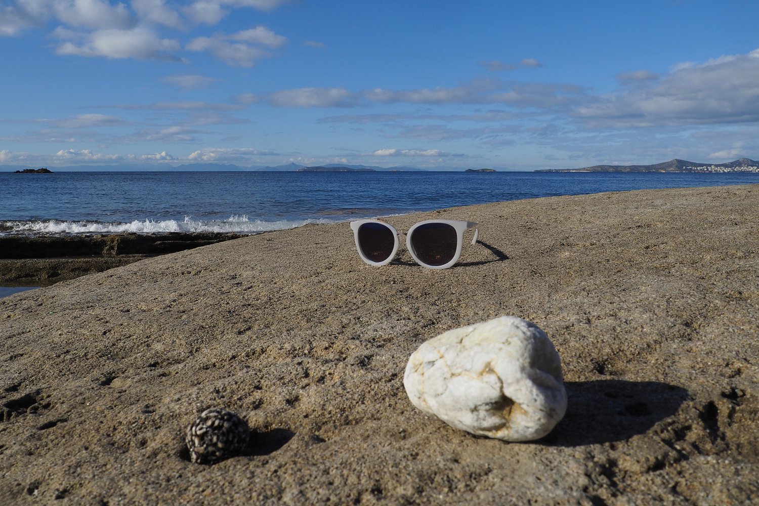 Με μια απλή φωτογραφία τραβηγμένη από κινητό, που λειτουργεί ως background, και με τη βοήθεια της AI, δημιουργούμε εικόνες προβολής γυαλιών ηλίου με τρόπο άμεσο, οικονομικό και πλήρως DIY. Η επιφάνεια του βράχου, η θάλασσα και το φυσικό φως συνθέτουν ένα αυθεντικό περιβάλλον, μέσα στο οποίο το προϊόν ενσωματώνεται οργανικά και πειστικά. Ο βράχος λειτουργεί ως φυσική βάση, ενισχύοντας την αίσθηση ρεαλισμού και σταθερότητας.