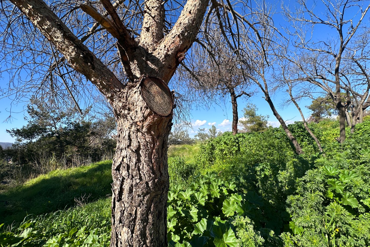 Η αποχώρηση του χειμώνα γίνεται ορατή μέσα από την αντίθεση ανάμεσα στα γυμνά δέντρα, το έντονο φως του ήλιου και το πράσινο έδαφος. Τα δέντρα, ακόμη χωρίς φύλλα, διατηρούν τα σημάδια της ψυχρής περιόδου, ενώ το έδαφος δείχνει ήδη ενεργή βλάστηση και εποχική ανάκαμψη.