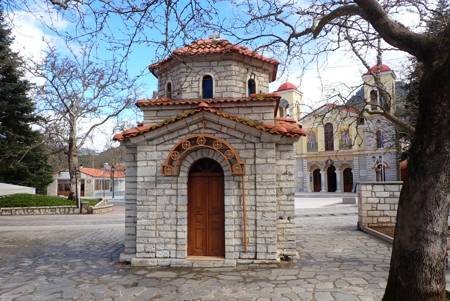 To μικρό εκκλησάκι–παρεκκλήσι που βρίσκεται στην πλατεία των Καλαβρύτων δεν έχει ξεχωριστή επίσημη ονομασία με Άγιο. Συνήθως αναφέρεται απλώς ως μικρό εκκλησάκι και λειτουργεί ως χώρος προσευχής και μνήμης.