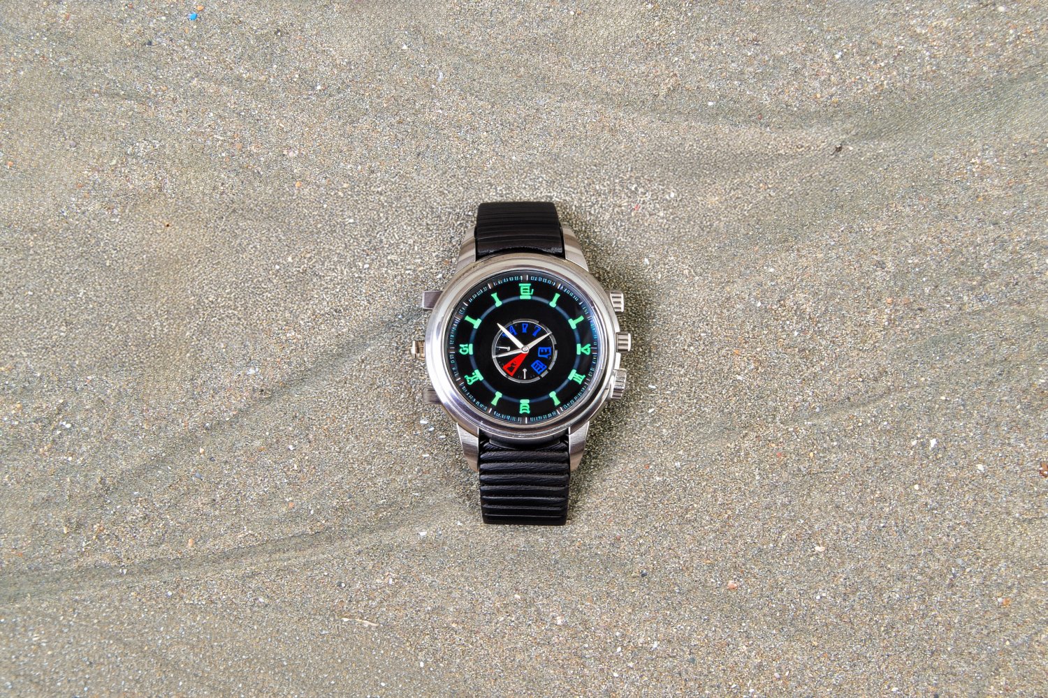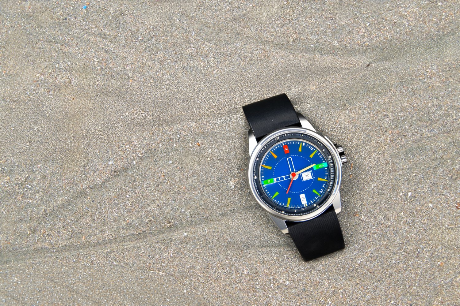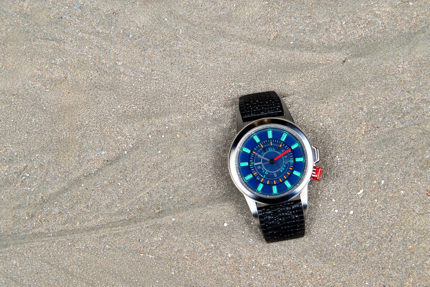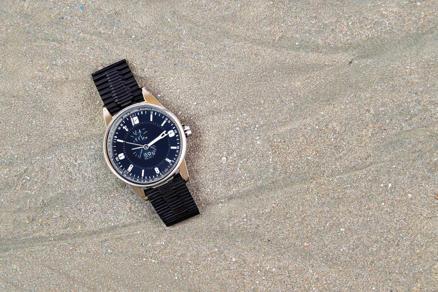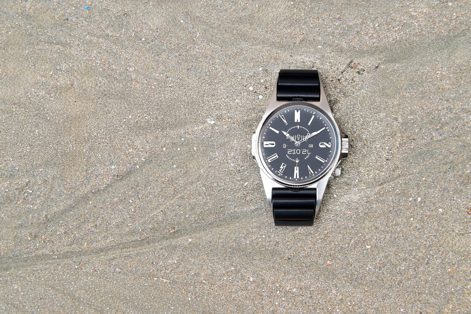 Η σειρά των φωτογραφιών βασίζεται σε μια απλή επιλογή: το φόντο παραμένει σταθερό και το προϊόν αλλάζει. Η βρεγμένη άμμος της παραλίας λειτουργεί ως ένα αυστηρό, φυσικό σκηνικό χωρίς τεχνητές παρεμβάσεις, προβάλλοντας την ανθεκτικότητα, τη στιβαρότητα και την άμεση σχέση των καταδυτικών ρολογιών με το θαλασσινό στοιχείο, την πίεση και την περιπέτεια.